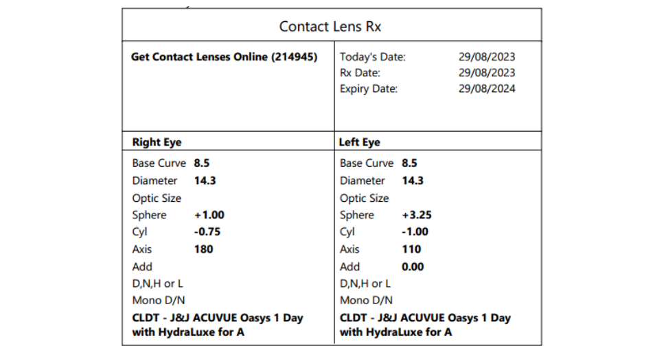 Reading a contact lens prescription can sometimes feel like deciphering a code, especially if you’re new to wearing contact lenses. However, understanding the information written on the prescription is an important step in your contact lenses journey, to make sure you get the right lenses for your eyes. Below is a breakdown of the various elements typically found in a contact lens prescription: